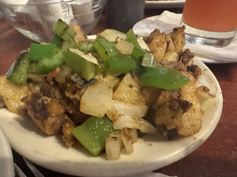 Italian sausage, peppers, onions, tomatoes, scrambled all together, homefries, and toast.