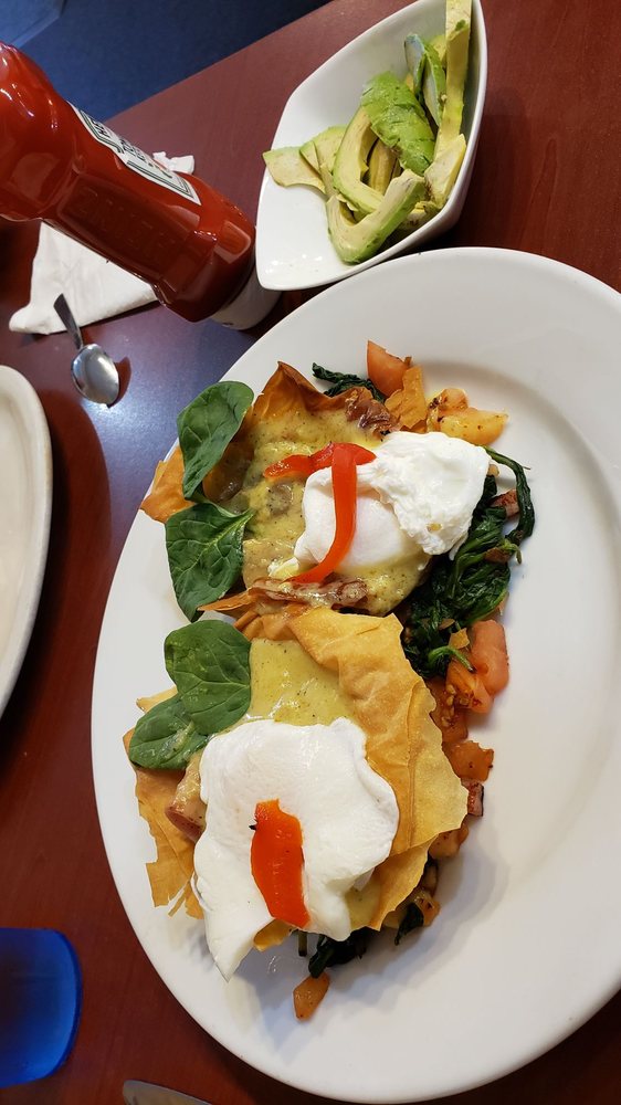 3 eggs with spinach, Canadian bacon, tomatoes, cheese, homefries, and toast.
